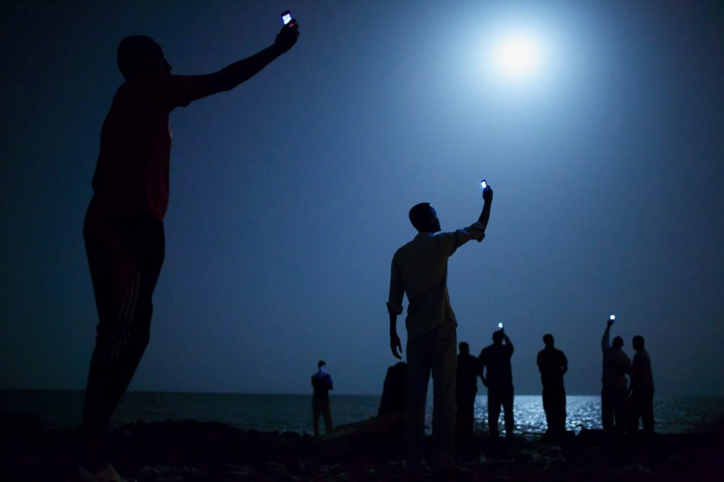African migrants crowd the night shore of Djibouti city, trying to capture inexpensive cell signals from neighboring Somalia—a tenuous link to relatives abroad. For more than 60,000 years, our species has been relying on such intimate social connections to spread across the Earth. Credit: John Stanmeyer/VII Foundation.