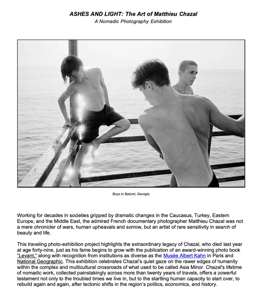 Matthieu passed away last year, too young at age 49, after a battle with cancer. The Out of Eden Walk is planning to organize Ashes and Light, a traveling photo-exhibition that celebrates his remarkable visual legacy, just as his fame begins to grow with the publication of an award-winning photo book “Levant,” along with recognition from institutions as diverse as the Musée Albert Kahn in Paris and National Geographic. This exhibition will start in the country of Georgia and travel to Turkey and France. At each stop, we will share the power of Matthieu’s quiet gaze, in the form of large-scale black and white photos, on the rawer edges of humanity. Your support will be recognized by name on a donor list posted at each location.